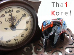 タイに行って、初めて欲しくてたまらなかった物なだけに、 思い入れは深いです。 田舎のリゾートホテルへ行った時、カフェで偶然見つけてしまった。 もう、こんなおもしろカワユイ物があっていいのか!?って。 スタッフに、どこで購入したのか、聞いてみたところ、 「わからない。」 と言われ、タイ全土をターゲットにこの時計を探すのは かなり至難の業だと思いつつも、目を光らせていれば、どこかで軌跡が起きるかも!? と淡い期待を抱いていると、ZENのお土産屋さんにて発見!! 意外と高い・・・。 500B以上した記憶があります。 値切って500Bだったような。 でも、この軌跡を無視するわけの無い私は自分用に購入♪ そして、インテリアも楽しめるようにと、 JJで小物を調達。 (これさー、丁度いいの探すのに、まる1日かかった。納得いかなきゃ安くても買わない融通の利かない買い物好き・・・?) マンゴーウッドのコースターを2枚敷いて、その上に時計+ゾウの人形(アユタヤ仕様)を置いて、出来上がり☆☆☆ ベッドの脇とかにセットして、アジアンテイストな睡眠エリアの完成! お香とか置くと尚良し◎だね。 ※ゾウの人形なんかは、よく見比べて選びましょう。 時たま、とんでもない顔した奴が紛れ込んでいます!! *Shopping Data* 時計→ZEN(ちょっと高い) ルンピニー(ナイトバザール) チャトチャック(ウィークエンドマーケット) |